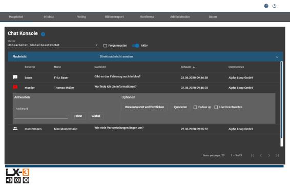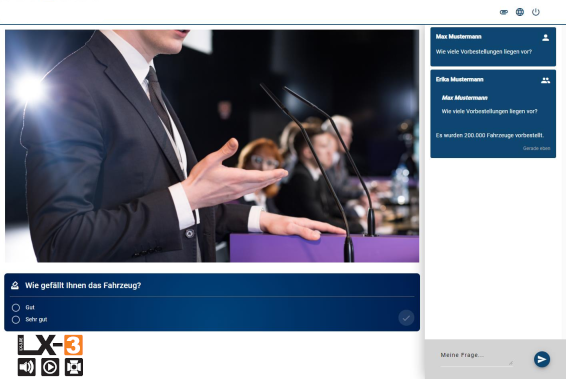 Dabei kann das Endnutzer-Interface im Web in Ihrem CI gestaltet und über ein eigenes Backend von beliebig vielen Moderatoren / Administratoren live gelenkt werden. Das Ganze ist selbstverständlich bei Bedarf auch mehrsprachig ausgeführt.